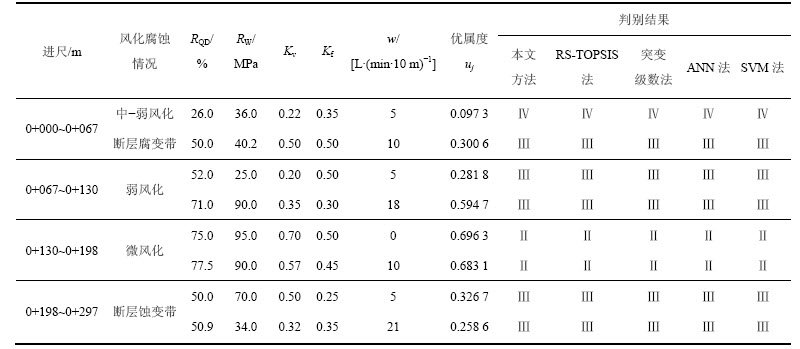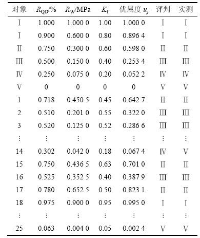 将各对象的优属度对照岩体质量分类的优属度范围,得到相应的岩石质量评判。从表4可知:除了第14组将Ⅴ级岩体判为Ⅳ级岩体以外,其他评判结果与实际相符。这与文献[16]误判结果一致,其原因可能是该组岩体质量介于两级之间,使得把介于两级之间的岩体判为其中的一级。