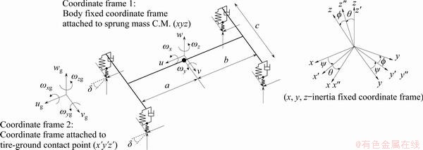 Figure 2 14-DOF vehicle model and coordinate frames[56, 58]