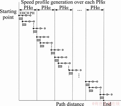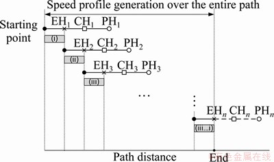 Moreover, to compare with the method of optimization with receding horizon along the entire path, Figure 12 shows how the extended scheme for generating minimum-time speed profile and how the receding horizon works for path tracking and speed control along one moving prediction window, in which the definitions of PH, CH and EH are the same as those described in Figure 10.