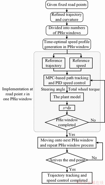 Herein, with the predefined tracking objectives along the entire trajectory including the vehicle longitudinal position x, lateral position y, heading angle ψ and road curvature κ, the forward-backward integration scheme mentioned in Section 3.2 is further extended to consider the speed profile generation in one moving prediction window. The entire path is divided into numbers of PHα horizons(representing one window for longitudinal velocity profile generation) and a minimum-time speed profile is generated in this window. The procedures of path tracking and speed control in one moving prediction window are specified in the flowchart shown in Figure 11.