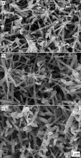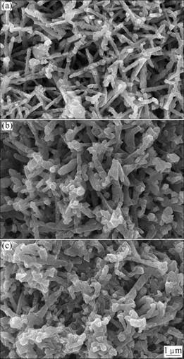 Fig.3 SEI micrographs of etched surfaces of Si3N4-AlN composite ceramics with various annealing times at 1 450 °C: (a) 0 h; (b) 2 h; (c) 4 h