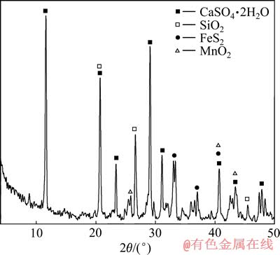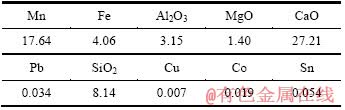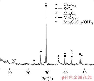 低品位锰矿的XRD分析结果见图1。由图1可知,低品位锰矿的主要成分为CaCO3、SiO2、Mn3O4、MnO1.88和Mn6Si4O10(OH)8。矿物中锰主要分布在高价氧化物Mn3O4和MnO1.88中,少部分以碳酸锰存在,只有极少部分赋存在Mn6Si4O10(OH)8中。钙主要以碳酸钙的形态存在,酸浸后大部分生成硫酸钙进入渣中。从试验结果来看,由于试验所得浸出液过滤效果良好,没有形成大量硅胶导致难过滤现象,因此推测原矿中的硅主要以石英形态存在,大部分SiO2不影响浸出过程和中和净化过程,少量与金属结合形成硅酸盐,在浸出过程中随锰浸出而进入溶液中,如果在浸出过程中能对含硅较高的矿石进行有效处理,对拓宽锰的冶金原料来源将有重要意义。
