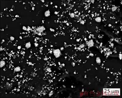 图2所示为低品位锰矿的SEM像。从图2可以看出,低品位锰矿的颗粒粒径较小(由于已经用球磨机磨成粉状),形状不规则,粒度分布不均匀,直径在5~30 μm之间,部分粒径比较大的类球状颗粒是由许多小粒子团聚而成的,且大部分固体颗粒外表面粗糙,凸凹不平,呈现不平整的表观形貌。