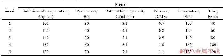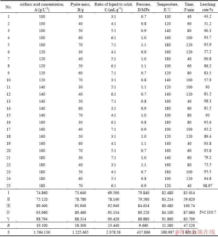由于本试验属于液、固、气三相反应,因此,可以认定浸出温度、初始硫酸浓度、硫铁矿量、液固比、空气分压和浸出时间是本试验的主要影响因素。为优化加压浸出低品位锰矿工艺,选取浸出温度、初始硫酸浓度、硫铁矿量、液固比、空气分压和浸出时间6个因素,各取5个水平,设计六因素五水平正交实验,确定较佳加压浸出低品位锰矿工艺。正交实验设计和结果见表4和5。