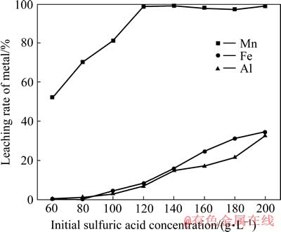 试验条件如下:固定低品位锰矿粉100 g,浸出温度130 ℃,液固比5 mL/g,硫铁矿量50 g,空气压力0.8 MPa,浸出时间120 min,搅拌转速500 r/min。考察初始硫酸浓度对锰、铁、铝浸出率的影响,结果见图4。溶液酸度是重要的影响因素(高价氧化锰以MnO2为例):
