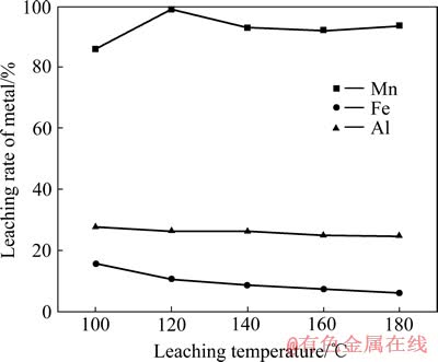 试验条件如下:固定低品位锰矿粉100 g,初始硫酸浓度120 g/L,液固比5 mL/g,硫铁矿量50 g,空气压力0.8 MPa,浸出时间120 min,搅拌转速500 r/min。考察浸出温度对锰、铁及铝浸出率的影响,结果见图5。从图5可看出,当反应温度低于120 ℃时,锰的浸出率随反应温度升高而增大。这主要是因为负载锰的低品位锰矿物在较高温度下的硫酸介质中具有更高的反应活性,更易浸出,因此有更多的锰被浸出而进入液相。反应温度高于120 ℃后继续升高温度,锰浸出率变化不大,反而稍有降低。原因可能是浸出反应过程中,高价锰对硫铁矿的氧化作用形成氧化产物硫,当温度高于119 ℃时,未反应完全的锰矿粉将会被硫膜包裹,由于S0的强疏水性和非导电性,从而阻止了锰矿粉和反应介质的接触,阻碍了浸出反应进一步进行。克服这一问题有效的办法就是破坏硫膜,即选择一种有效的添加剂(如木质素磺酸钠、褐煤等)以改变锰矿粉的表面性质,阻止硫膜形成。铁浸出率则随反应温度升高而减小,当温度从100 ℃升到180 ℃,铁浸出率从15.6%降为5.93%,这主要是因为矿粉中的铁化合物在浸出反应初期与酸反应生成Fe3+,随浸出后期体系酸度降低,Fe3+又逐步水解生成赤铁矿而进入渣相,并且随着浸出反应温度的升高,Fe3+水解反应速度逐步加快。由图5还看出,随着浸出反应温度的升高,Al的浸出率稍有降低,但变化不大。综上所述,选择120 ℃为较优浸出反应温度。