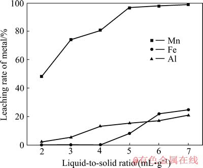 低品位锰矿物相分析显示锰元素主要存在于高价氧化锰中,在浸出过程中有效实现锰与铁、铝等杂质元素的分离是关键。为分析低品位锰矿中锰、铁及铝的浸出行为,实现这3种金属元素的高效分离,得到最优浸出工艺条件,进行了单因素实验研究,详细考察了液固比、始酸浓度、硫铁矿量、温度、压力和浸出时间对锰、铁及铝浸出率的影响。