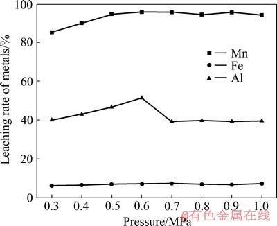 但压力过高会对高压釜材料性能要求提高,并增加制造成本,故在兼顾锰浸出率的前提下,宜选择较低的空气压力,选择0.7 MPa为较优浸出压力。