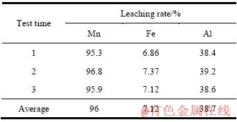 通过上述正交实验和单因素实验结果可知,在硫酸介质中加压还原浸出低品位锰矿的优化浸出工艺条件如下:低品位锰矿粉100 g,初始硫酸浓度120 g/L,浸出反应温度120 ℃,硫铁矿量50 g,液固比5 mL/g,浸出时间100 min,浸出压力0.7 MPa,搅拌转速500 r/min。为了验证优化浸出条件下的工艺稳定性,特进行了重复实验,具体结果见表6。从表6可看出,本工艺在优化浸出条件下重复性很好,工艺稳定。从实验结果可知,锰的浸出率为96%,而铝和铁的浸出率分别为38.7%和7.12%,实现了锰与铝和铁的高效分离。