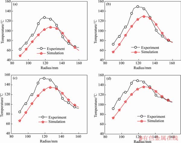Fig. 4 Comparison of radial temperature on brake disc surface between numerical simulation and experiment