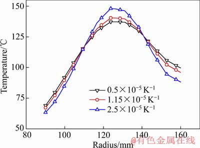 图7 闸片热膨胀系数对最高温度时刻制动盘表面径向温度分布的影响
