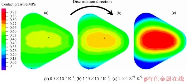 Fig. 8 Contact pressure at highest temperature under different thermal expansion coefficient