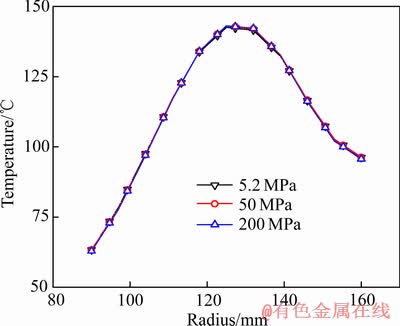 图9所示为闸片热传导系数30 W/(m·K)、热膨胀系数1.15×10-5 K-1时闸片弹性模量对最高温度时刻制动盘表面径向温度分布的影响。可见,随闸片弹性模量的增大,制动盘面径向温度变化不明显,最高温度出现在盘半径125 mm处。闸片弹性模量从5.2 GPa分别增加到50 GPa和200 GPa时,最高温度从142.6 ℃仅增加了0.4 ℃和0.5 ℃。可见,三种弹性模量下,制动盘摩擦区域径向上的温度分布差异不明显。