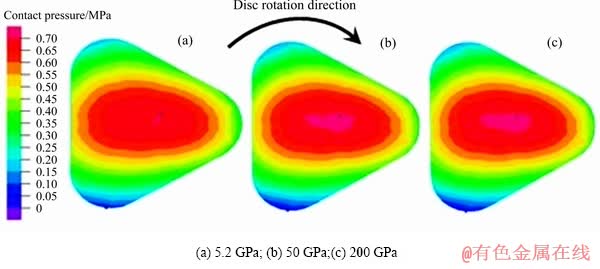 Fig. 10 Contact pressure at highest temperature under different elastic modulus