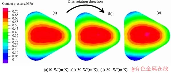图12所示为闸片弹性模量5.2 GPa、热膨胀系数1.15×10-5 K-1时不同闸片热传导系数下最高温度时刻闸片接触压力。可见,随闸片热传导系数的增大,摩擦面中部椭圆形高接触压力区径向上的宽度变大,接触压力梯度减小。最大接触压力略有增加,当闸片热传导系数10 W/(m·K)时,最大接触压力为0.702 MPa(见图12(a)),热传导系数增大到30 W/(m·K)和80 W/(m·K)时,最大接触压力分别增大到0.721 MPa和0.725 MPa(见图12(b)和(c))。