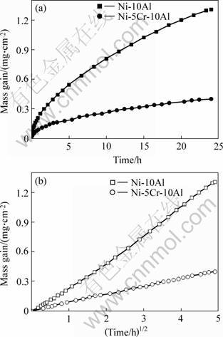 Fig.2 Scaling kinetics of Ni-10Al and Ni-5Cr-10Al alloys oxidized at 1 000℃ in 0.1 MPa O2: (a) Normal plots; (b) Parabolic plots