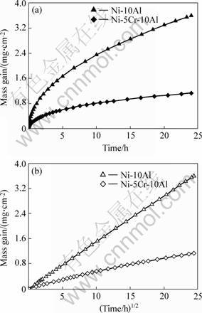 Fig.1 Scaling kinetics of Ni-10Al and Ni-5Cr-10Al alloys oxidized at 900 ℃ in 0.1 MPa O2: (a) Normal plots; (b) Parabolic plots