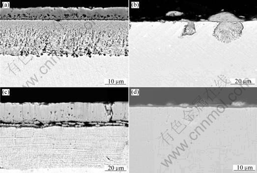 Fig.3 Cross sectional images(SEM/BEI) of Ni-10Al at 900 ℃ (a) and 1 000 ℃ (c), and Ni-5Cr-10Al at 900 ℃ (b) and 1 000 ℃ (d) after 24 oxidation in 0.1 MPa O2