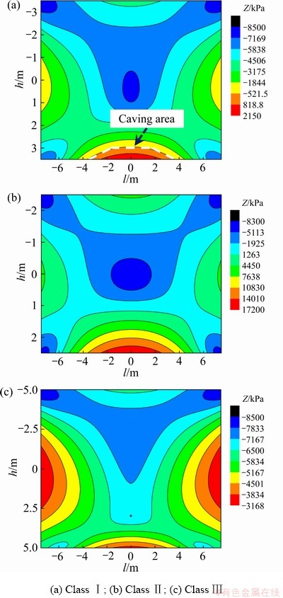 当单元采场回采结束后,采空区上覆岩体将形成应力拱,承载上部围岩的重力荷载[11]。Ⅰ、Ⅱ类破坏从顶板下部区域开始,在其他部位发生破坏前属于正常冒落,顶板由于拱架效应保持稳定。Ⅲ类破坏没有明显的拱架效应顶板往往发生突发失稳破坏。