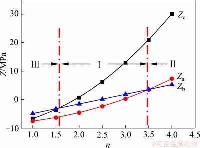 由2.1节分析知,顶板区域岩体破坏判定值Z的4个峰值分别位于顶板上部、下部以及两侧中心位置(见图2)。由于顶板受力具有对称性分布特征,左右两侧Z值相等。因此,4个峰值可分别用Za、Zb、Zc进行表示。