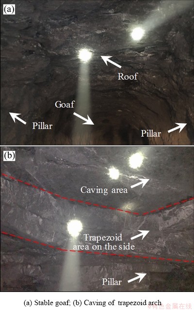 为了验证计算结果,对+35 m、+7 m水平中段采空区进行实地考察,图10(a)所示为+7 m水平中段3#采空区顶板实景图,由于顶板厚大,该采空区形成后始终保持稳定,现场未发现“梯形拱”冒落现象。图10(b)所示为+35 m水平中段7#采空区顶板冒落实景图,采空区形成初期顶板局部发生冒落现象,但在形成“梯形拱”后保持整体稳定。