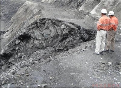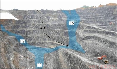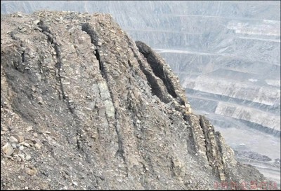 (2) 楔形体滑坡。当2个相交的断层面与边坡坡面形成楔形体时,或者岩层层面与断层面及边坡坡面形成楔形体时,由于岩层层面之间摩擦力较小,断层带岩体破碎,形成楔形体构造,在自重应力的作用下,易形成楔形体滑坡。如西部边坡540~600 m,处于F2和F3的交汇区,岩体十分破碎,频繁出现楔形体滑坡失稳,如图3所示。特别是在多雨季节,楔形体滑坡的发生频率更高。