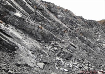 (3) 倾倒滑坡。岩层走向与边坡走向近似一致,岩体倾角大于70°,当下部台阶开挖后,在自重应力、雨水和爆破震动的多重因素作用下,易产生倾倒破坏[12-13]。如北部边坡600~520 m和西部边坡580~620 m,都曾出现过倾倒滑坡,如图4所示。
