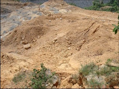 (4) 松散土体整体滑坡。露天矿西部、北部覆盖有10余m厚的松散土体,其内聚力及内摩擦角比较小,随着下部露天台阶的开挖,原有的力学平衡被打破,尤其受西南地区多雨天气的影响,往往在大雨过后出现松散土体的整体滑移失稳,如图5所示。