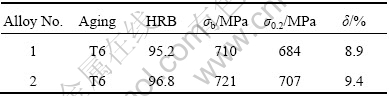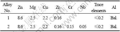 选择工业纯Al(99.9%)、工业纯Zn(99.9%)、工业纯Mg(99%)和Al-4.56Cr、Al-4.18Zr、Al-2Nb中间合金为原料,制备了表1所列的2种合金。合金的熔炼在坩埚炉中进行,温度控制在700~740 ℃,采用0.2%~0.4%的六氯乙烷(C2Cl6)精练,静置10~15 min,浇入直径为45 mm的石墨模中,之后在460 ℃将铸锭均匀化处理24 h。铸坯的热挤压在500 t的压机上进行,挤压前预热温度为400~430 ℃,挤压筒直径为45 mm,挤压摸孔直径为15 mm,挤压比为9,适当控制挤压速度以保证变形组织的均匀性。