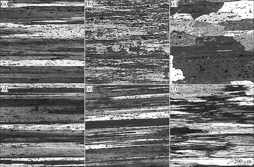 Fig.2 Optical micrographs of studied alloys under different annealed conditions: Al-Zn-Mg-Cu-Zr, (a) Hot extruded condition; (b) 470 ℃ for 2 h; (c) 480 ℃ for 2 h; Al-Zn-Mg-Cu-Zr-Cr-Nb, (d) Hot extruded condition; (e) 470 ℃ for 2 h; (f) 480 ℃ for 2 h