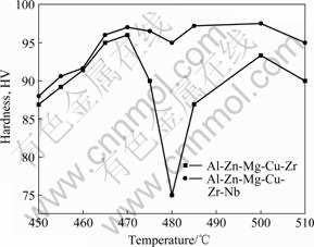 图3所示为合金在不同温度淬火后的硬度与退火温度的关系曲线。由图可以看出,两种合金在450 ℃到470 ℃之间硬度呈上升趋势,Al-Zn-Mg-Cu-Zr-Cr-Nb合金的硬度要高于Al-Zn-Mg-Cu-Zr合金的;在470 ℃到480 ℃之间硬度呈下降趋势,Al-Zn-Mg-Cu-Zr合金硬度的下降幅度更大,最小硬度值为HV75,Al-Zn-Mg- Cu-Zr-Cr-Nb合金硬度的下降幅度小,最小硬度为HV96.2,比Al-Zn-Mg-Cu-Zr合金的最小硬度高HV 21.2;在480 ℃之后,硬度又呈现上升趋势,而在500 ℃以后,硬度下降。`