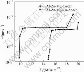 Fig.5 Curves of stress corrosion crack growth rate v vs stress intensity factor KI of studied alloys