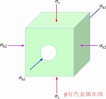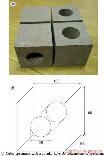 In this study, the specimens were cut from massive intact, medium-fine-grained red sandstone, from Linyi city, Shandong Province, China. Referring to the test of HE et al [25] and KUSUI et al [27], the red sandstone was processed into cubic specimens (100 mm×100 mm×100 mm) with a circular hole (Φ50 mm×100 mm) to study the spalling characteristics of hard rock tunnels at different depths, as shown in Figures 1(a) and (b). The uniaxial compressive strength (σc), elastic modulus, density and longitudinal wave velocity of red sandstone are 97.5 MPa, 18.6 GPa, 2.43 g/cm3 and 3180 m/s, respectively.