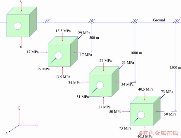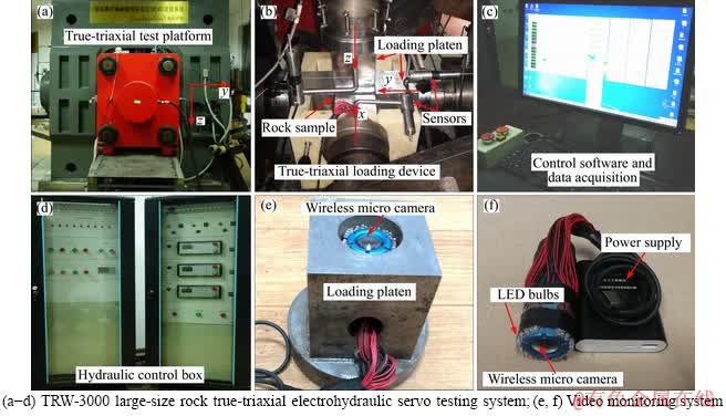 To investigate the influence of depth on induced spalling in hard rock tunnels, the failure process of the rock surrounding four tunnels at different depths (0, 500, 1000 and 1500 m, where 0 m is a control group) was simulated experimentally. A TRW-3000 large-size rock true-triaxial electrohydraulic servo testing system (see Figures 2(a)-(d)) was used to perform true-triaxial compression tests on cubic specimens with a prefabricated circular hole. During the tests, the sidewall failure process of the specimens was monitored and recorded in real-time by monitoring equipment specially developed in-house (see Figures 2(e) and (f)). The true-triaxial test system and monitoring equipment have been described in detail by GONG et al [33], so this information will not be restated here. According to the calculation method of in situ stress used by GONG et al [33], the in situ stresses (vertical principal stress (σv), maximum horizontal principal stress (σh1) and minimum horizontal stress (σh2)) at the three depths (500, 1000 and 1500 m) were obtained, and the in situ stress of the 0 m specimen is set to 0 MPa. The in situ stress at four depths is presented in Table 1.