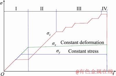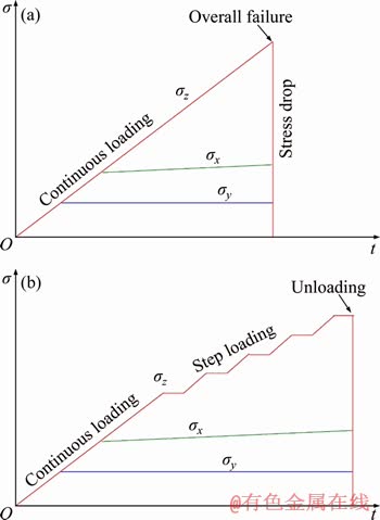 After hard rock tunnel excavation, stress redistribution leads to the formation of a stress concentration in the rock around the tunnel. When the induced stress exceeds the strength of the surrounding rock, the instability is primarily associated to the rock spalling or rockburst. Generally, spalling and rockburst are local failure of hard rock tunnels, i.e., the overall instability of the tunnel does not occur after spalling or rockburst. Therefore, the overall failure of the specimens should be prevented as much as possible during the test. To better simulate the process of induced spalling in hard rock tunnels, the stress loading path proposed by GONG et al [33] was used in the experiment, as shown in Figure 5.