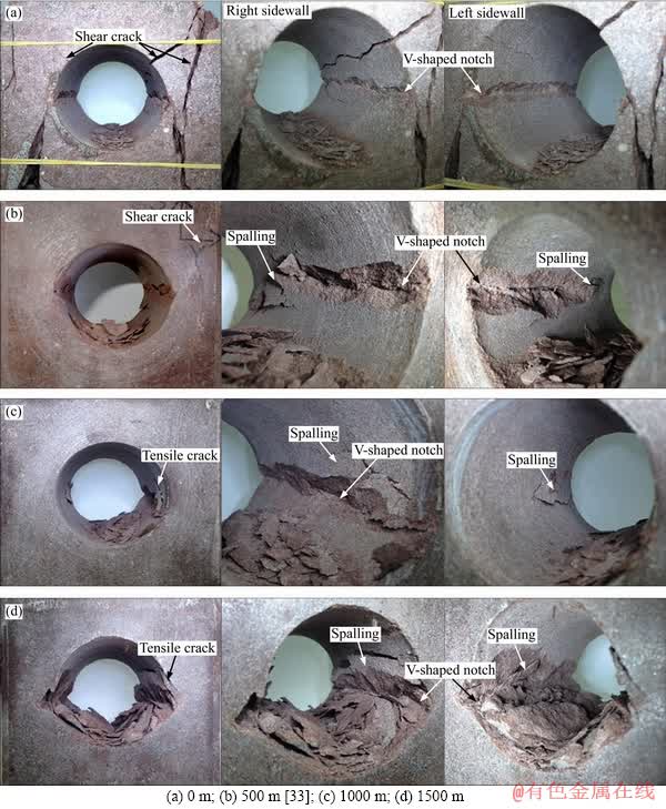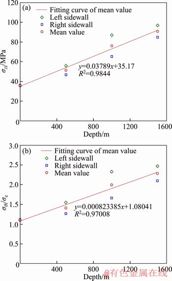 exhibits a good linear relationship with the depth within a certain error range. Generally, spalling occurs when the ratio of the tangential stress to the strength reaches 0.4-0.5 in field tunnels [20]. In this paper, the ratios of σθi/σc at different depths are significantly greater than 0.4-0.5. The author believes that the main reasons for this result are as follows. 1) Since the experiment uses a reduced-scale tunnel model, the results are affected by the scale effect to some extent. MARTIN [39] performed uniaxial compression tests on 13 granite specimens with different hole diameters (from 5 mm to 103 mm) and found that the σθi/σc ratios are greater than 1 when the hole diameter is less than 75 mm. It is reported that this is attributed to the strength size effect; the smaller the diameter is, the more obvious the strength size effect is. In this study, when the depth is 0 m, the specimen is loaded in only the vertical direction, so the rocks around the hole have a unidirectional stress state and will be damaged when the tangential stress around the hole reaches its uniaxial compressive strength (i.e., σθi/σc=1). However, the test result of this study is σθi/σc>1 (hole diameter (F50 mm) is less than 75 mm), which is generally consistent with the results obtained by MARTIN [39]. 2) The difference in surrounding rock strength between the field tunnel and tunnel model. Practical experience indicates that the field strength of rock massive is approximately one half the laboratory strength [39], which results in test results greater than field results. 3) Due to the true-triaxial loading test performed in this paper (except for specimen with a depth of 0 m), the sidewall initial failure is affected by the axial stress. In general, the tunnel is simplified to a plane strain problem for mechanical analysis, considering only the two principal stresses in the plane of the tunnel cross-section and neglecting the influence of the stress in the axial direction of the tunnel. Therefore, in most cases, the rock around the tunnel is approximately considered to be in a unidirectional stress state. However, the experimental results in this study show that, as the