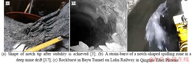 With the increasing demand for mineral resources and continuous consumption of shallow resources, a large number of mines and tunnels are gradually turned to deep underground [1, 2]. After tunnels (or caverns) excavation, many stress- induced failures usually occur under high tangential stress conditions, which seldom occur at shallow depths [3, 4]. When the process of rock failure occurs in an unstable manner, it usually accompanies the rapid release of strain energy, resulting in a large amount of rock suddenly failing and ejecting (i.e., rockburst). Thin rock slabs are formed layer by layer spalling, leading to the failure of the support structure and the formation of V-shaped failure zones (i.e., V-shaped notches) on the tunnel sidewall. Under extreme stress conditions, the spalling process can lead to a complete collapse and seriously influence the long-term stability of tunnels. Rockburst often causes casualties,equipment damage and construction delays [5-7], which creates an enormous potential for safety hazards during the otherwise safe and efficient construction of tunnels. However, as tunnel depth increases, the problems of spalling and rockburst become more prominent, which has aroused widespread concern of rock mechanics researchers [8-16].