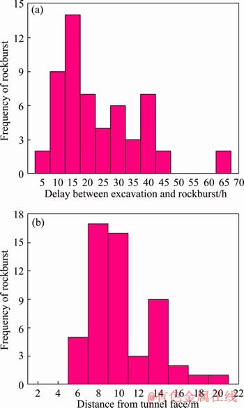 At present, there are two kinds of excavation methods in hard rock tunnels, i.e., the tunnel boring machine (TBM) and the drill-blasting methods. Different excavation methods have different unloading rates for the rock around the tunnel. In general, unloading time of the drill-blasting method is in milliseconds (ms), while the unloading time of the TBM method is in seconds (s). LU et al [46] and YAN et al [47] performed in-depth studies of the surrounding rock damage and rockburst caused by these two excavation methods. It is reported that the strain rate caused by the unloading with the TBM method is less than 10-1/s, the surrounding rock is relatively stable, and the unloading effect caused by excavation has little influence on the rockburst. The strain rate caused by unloading with the drill-blasting method is greater than 10-1/s and is transient dynamic unloading, and the unloading effect produced has a greater effect on the surrounding rock damage. It is also noted that the blasting disturbance is not the decisive factor of the occurrence of rockburst but only a triggering factor. HE et al [48] performed strain rockburst tests on cubic sandstone specimens with a prefabricated circular hole using a “step loading + disturbance” loading method. It was found that when the step loading stress (i.e., static stress) is lower than a certain threshold, the applied disturbance will not cause rock failure; only when the step loading stress increases to a certain level will the applied disturbance induce the occurrence of rock fragment ejection. This result indicates that static loading is the dominant factor inducing rockburst. In addition, the case analysis of on-site rockburst shows that the vast majority of rockbursts occurred during the process of stress adjustment after tunnel excavation. For example, JIANG et al [49] and YAN et al [47] performed a statistical analysis of the rockburst occurrence time of the pilot tunnels at the Jinping II Hydropower Station. The results indicate that the peak period of rockburst occurred within a few hours after tunnel excavation, usually within 20 h (see Figure 15(a)). Currently, it has been a long time since unloading due to machinery or blasting excavation, and the rock around the tunnel is in a quasi-static stress field. Meanwhile, YAN et al [47] also performed a statistical analysis on the distance from the location of the rockburst to the tunnel face of the pilot tunnels at the Jinping II Hydropower Station; the results indicate that the majority of rockbursts occurred in the range of 6-12 m away from the tunnel face (see Figure 15(b)) and that this trend is similar to those of rockburst in other rock engineering applications. CHEN et al [50] analysed the occurrence time of rockburst and noted that rockburst generally lagged more than 6 h after tunnel excavation and that the distance from the location of the rockburst to the tunnel face was generally greater than 5 m. In addition, field engineering practices have indicated that the location of spalling generally lags behind the tunnel face by a certain distance [51, 52]. Therefore, most of the spalling and rockburst occurred primarily owing to the static stress loading of the surrounding rock caused by the stress redistribution when the tunnel face advanced, and the unloading effect due to excavation is not the main reason for spalling and rockburst.