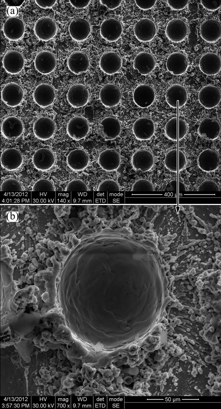 The deposition of solid lubricant coatings directly on the light metal substrates did not significantly improve the tribological properties, because of the low load bearing capacity of the substrate and poor adhesion of the coating [16]. The hard coatings with chromium interlayer on textured surfaces were preferred for MoS2 coating, due to their better performance [17]. The micro reservoirs were machined by Nd:YAG laser beam on the textured and coated surfaces with chromium interlayer. The reservoirs were filled by MoS2 solid lubricant coating. The SEM image as shown in Fig. 4 shows the texturing pattern on the AlCrN coating surface by laser beam.