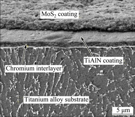 Fig. 6 SEM image on cross section of MoS2-coated surface along with TiAlN composite coating and chromium as interlayer