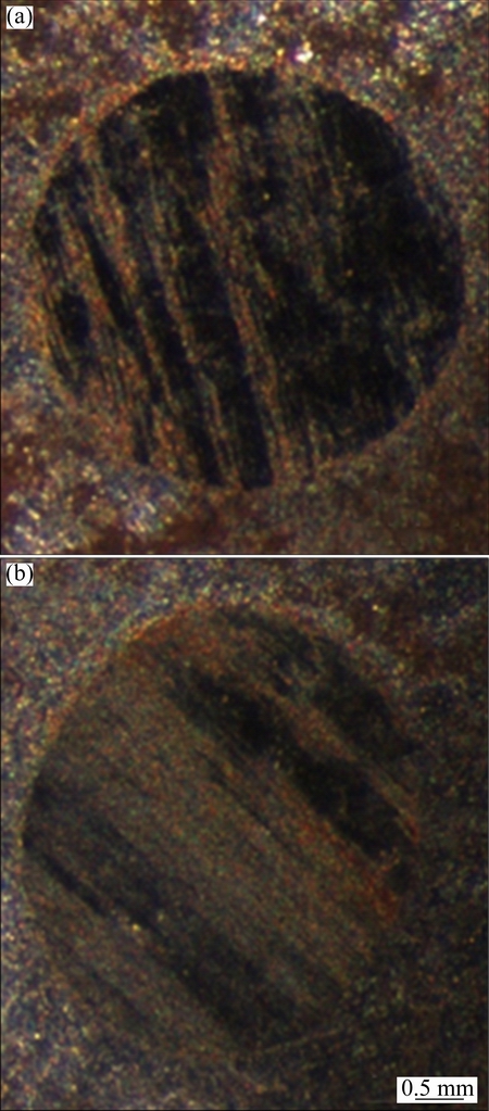 Fig. 13 Optical micrographs of MoS2-coated worn pin surfaces of textured TiAlN coating (a) and textured AlCrN coating (b) after wear test against AISI52100 disc at 29.4 N