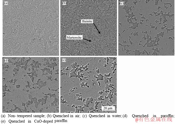 The SEM micrographs of different heat-treated samples are shown in Figure 2. As shown in the figure, the non-tempered sample (Figure 2(a)) has a ferrite/pearlite structure. The results show that the samples quenched in water, paraffin and CuO-doped paraffin (Figures 2(c)-(e)) have a ferritic-martensitic structure [45, 46] but the air-quenched sample has a three-phase bainite- martensite-ferrite microstructure (Figure 2(b)) [47-50]. The formation of bainite reduces the size of martensitic envelopes. Figure 2(b) shows that the bainite breaks out of the prior austenitic grain boundaries. This causes the austenitic grains to be partitioned into smaller portions and, consequently, reduces the size of the martensite packets, which results in incomplete austenite decomposition and formation of bainite. The dispersion and fragmentation of martensite strips with a short distance between the martensite blocks, separated by relatively flexible bainite, leads to the improved ductility (as reported in Figure 6) [51].