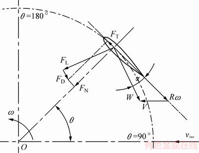 H型垂直轴风力机属于升力型垂直轴风力发电机,风作用在叶片上产生的切向力是风轮运转的主要驱动力,它是叶片所受升力和阻力在切线方向上的合力。由翼型空气动力学可知[11],叶片的切向力随攻角的变化而变化,在某一攻角处切向力会达到最大值。因此,计算最大切向力所对应的叶片攻角,进而通过这个攻角调节叶片桨距角使风轮获得最大的风能利用率[12]。