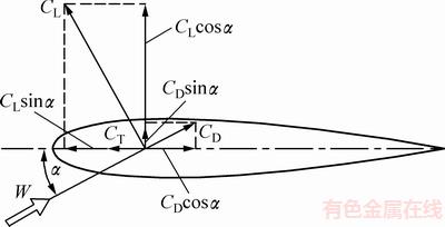式中:ρ为空气密度,在标准大气压下取1.225 5 kg/m3;c为叶片弦长;H为翼型展向的长度;CL和CD分别为翼型的升力系数和阻力系数,其值可由NACA系列翼型空气动力学特性数据库查得;CT为切向力系数,是CL和CD在弦长方向的合成值,它们之间的关系如图5所示。
