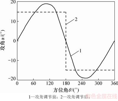 按图9所示的规律调节桨距角,得到变桨前后叶片攻角随方位角的变化规律,如图10所示。