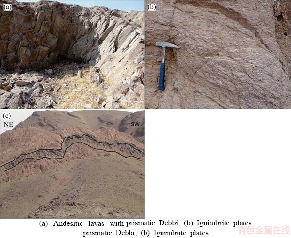 Basaltic-andesite lava flows are the product of volcanic eruptions in non-marine environment and are on the previous volcano-sedimentary units (Figure 2). Andesitic lava flows are the most in the area in terms of volume. The main texture of these samples is zoning texture, sieve texture, porphyry texture with microcrystalline background and glomerulopathy texture. Most components of andesitic rocks are plagioclases. More plagioclases show sieve texture and zoning (Figures 3(a) and (b)). Pyroxene, are mostly in form of pyroxene phenocrysts, and mostly have segregated blades. Almost all pyroxene phenocrysts are euhedral. Some pyroxene phenocrysts have zoning(Figure 3(c)). Amphiboles are also frequently seen in these samples and are subhedral and euhedral [10].
