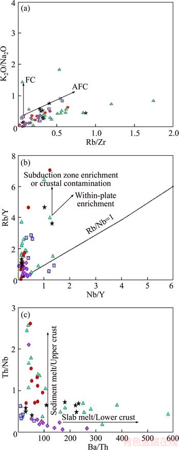 ROGERS et al [20] believe that for trends plotted in diagrams of changes in incompatible elements against incompatibles, if they are ascending linear and pass through the origin of coordinates, it can be said that fractional crystallization has a crucial role in the development of the region’s rocks. Some factors can cause changes in these processes such as inconsistencies in source, varying degrees of partial melting, incorporation and contamination of magma [21]. Changes in incompatible elements relative to each other for the studied samples are shown in the Ce and Y versus the Yb diagrams. In this chart, the pattern of changes in the studied samples follows linear process or is nearly linear and ascending (Figures 6(a) and (b)). Semi-deep dikes samples show a little deviation. Ratio diagram of changes in Ba/Y versus Ba has also been used, these changes show linear and ascending trend (Figure 6(c)), consequently all drawn trends indicate that fractional crystallization is the main process in the evolution of rocks.