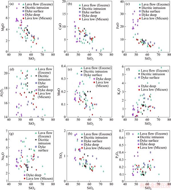 In diagram of naming alkali set against silica [12], samples related to volcanic rocks are in range of basalt, the tracky basalt, andesite basalt, andesite tracky basalt, andesite, tracky andesite, dacite and rhyolite (Figure 4(a)). And in silica diagram against alkali set [13], samples of the intrusive body and semi-deep dikes are in range of gabbro and diorite (Figure 5(b)). The dividing line of the range of alkaline from calc-alkaline has been reported [14], (Figure 4). In the triangular diagram [14] AFM (Alkali set-FeO–MgO diagram), most of samples are in the range of calc-alkaline and samples of semi-deep dikes and a few samples of lavas and one sample of intrusive body are in the range of tuleity (Figure 4(c)). Aluminum saturation diagram [15] of the samples of studied area, most of samples related to the lavas and dikes are in the range of Metalomin and samples of the intrusive body, some samples of dikes and intrusive body are in the range of aluminous (Figure 4(d)).
