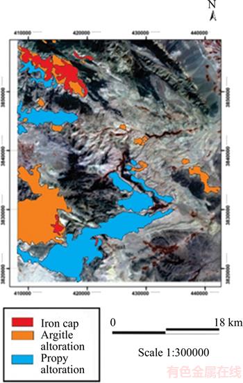 Image processing methods can be used to detect the altered areas and specific lithological units. One of these methods is band ratios and color ratio images to enhance the spectral response of minerals and reduce the spectral response of vegetation. ABRAMS et al [38] aparted this phyllic and potassic alteration zones from propylitic and argillic areas using color ratio images(Figure 13(b)). What should be noted here is that the aforementioned method for identifying alterations in region does not act as well as the band ratio method because of variations of lithology in the Tafresh area. It is worth mentioning that whatever shown in the band ratios, all are not representation of an alteration system associated with mineralization.