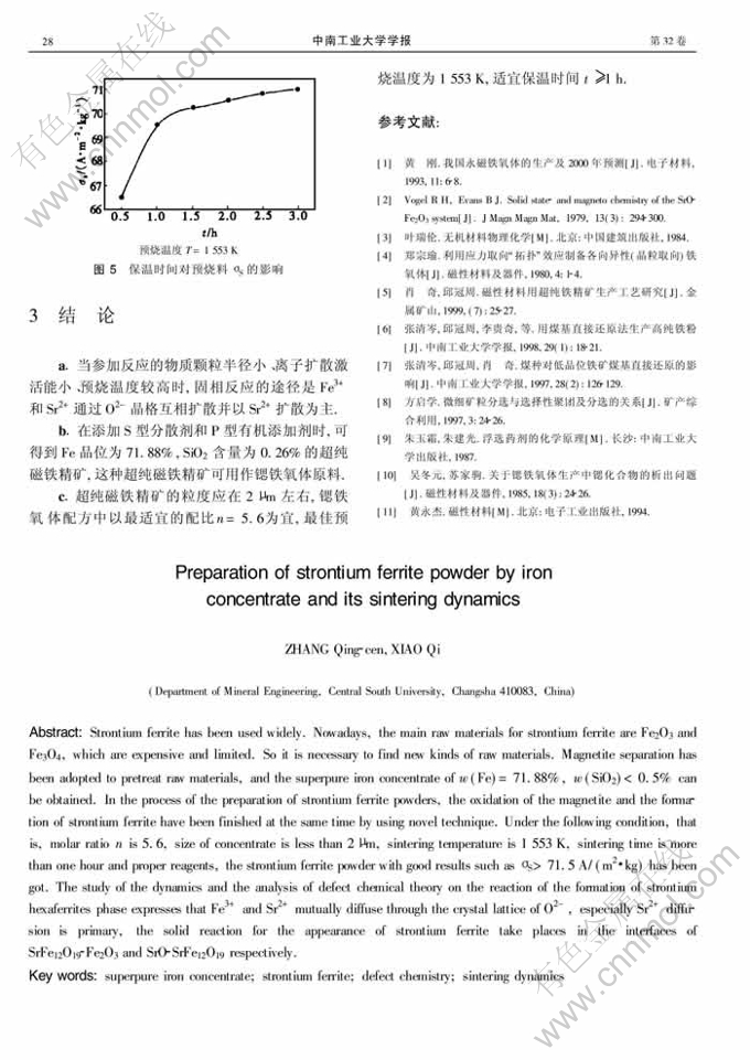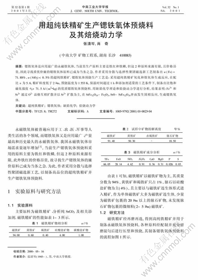 关键词:超纯铁精矿;锶铁氧体;缺陷化学;焙烧动力学